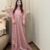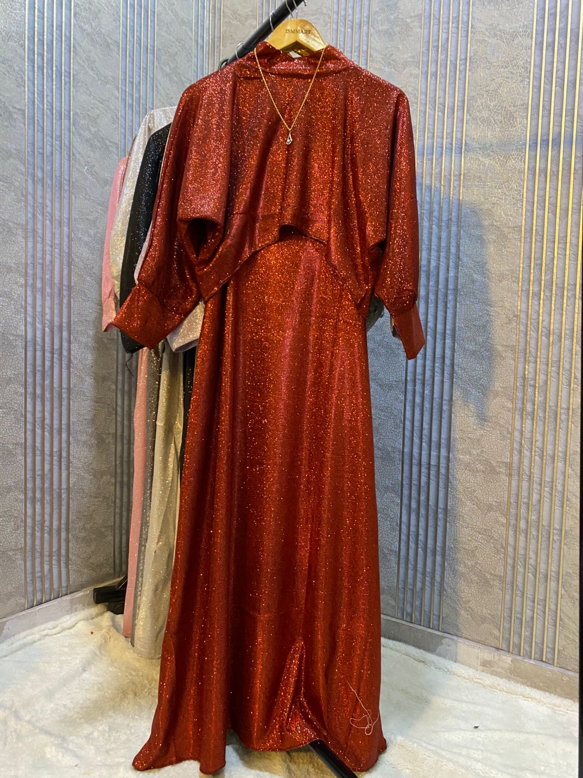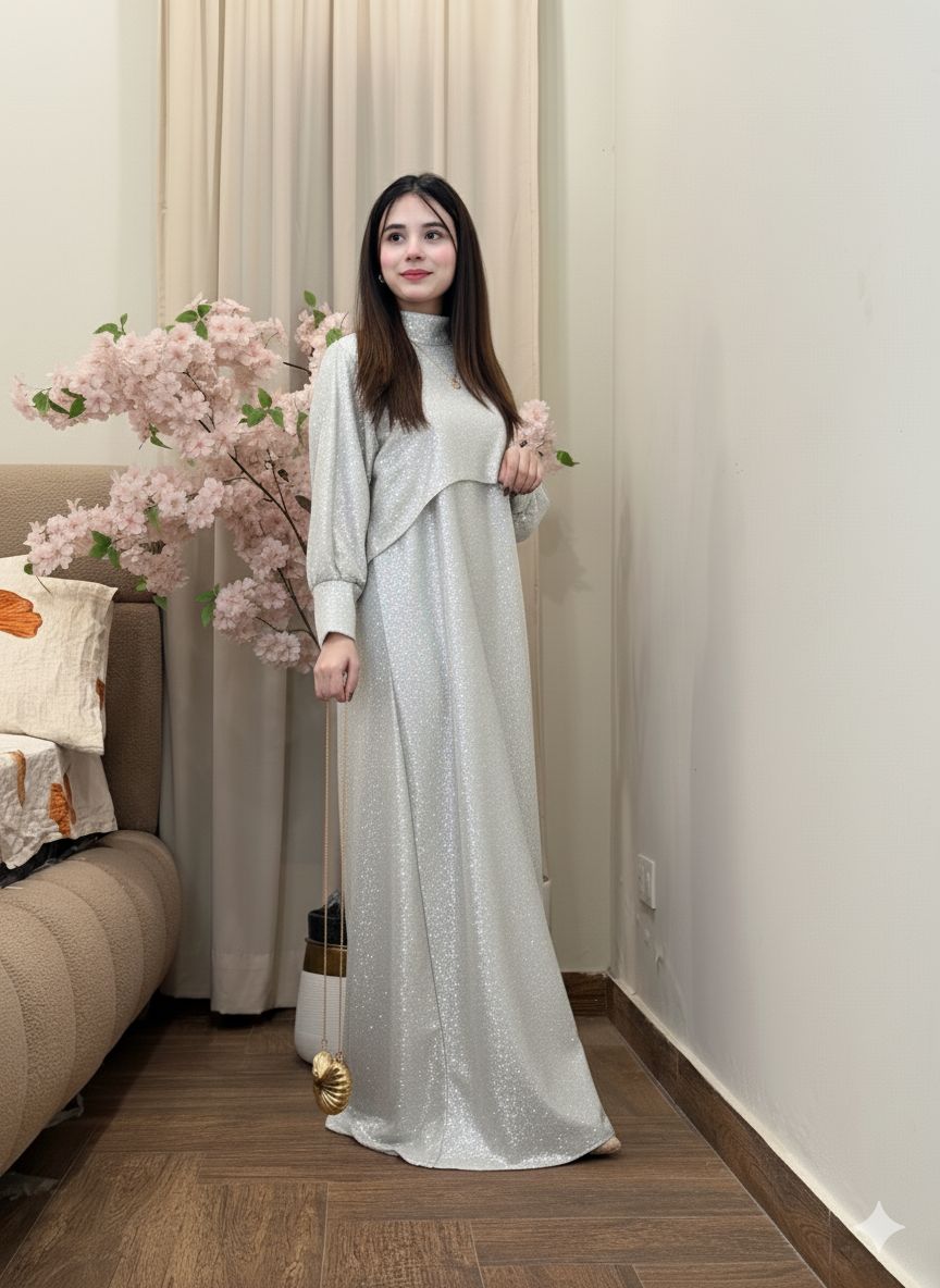 This outfit features a modest, flowing maxi paired with a beautiful shimmer cape overlay that adds grace, style, and movement.