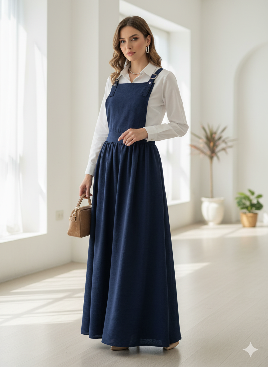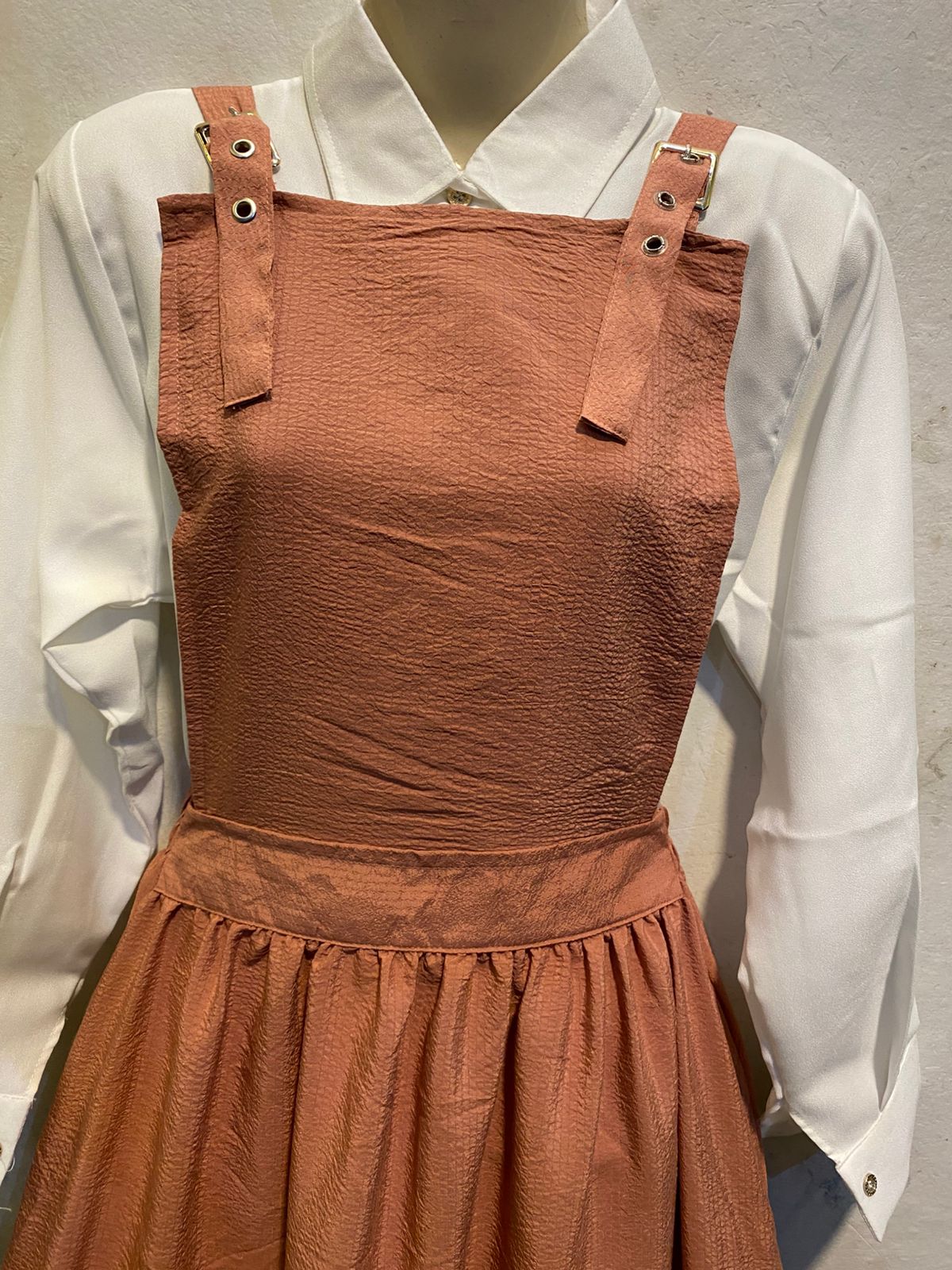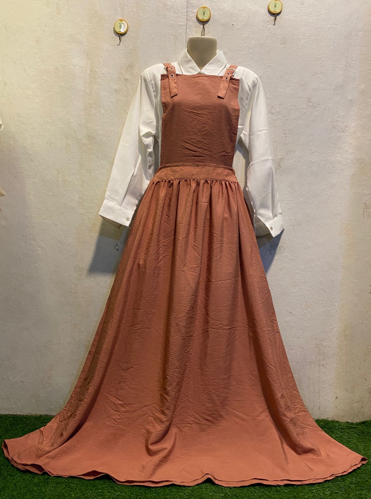 Stylish 2-piece pinafore maxi dress featuring a crisp white collared shirt paired with a rust-orange textured georgette pinafore. Designed with adjustable straps, a gathered waist, and a flowing maxi flare for an elegant yet modest look. Perfect for casual wear, work, or semi-formal gatherings.