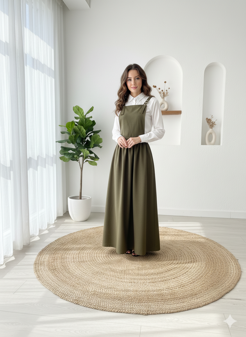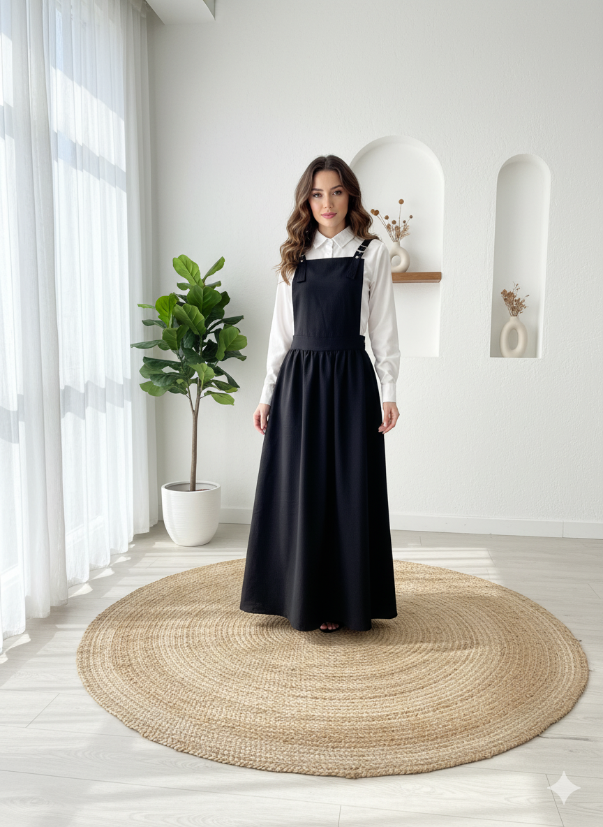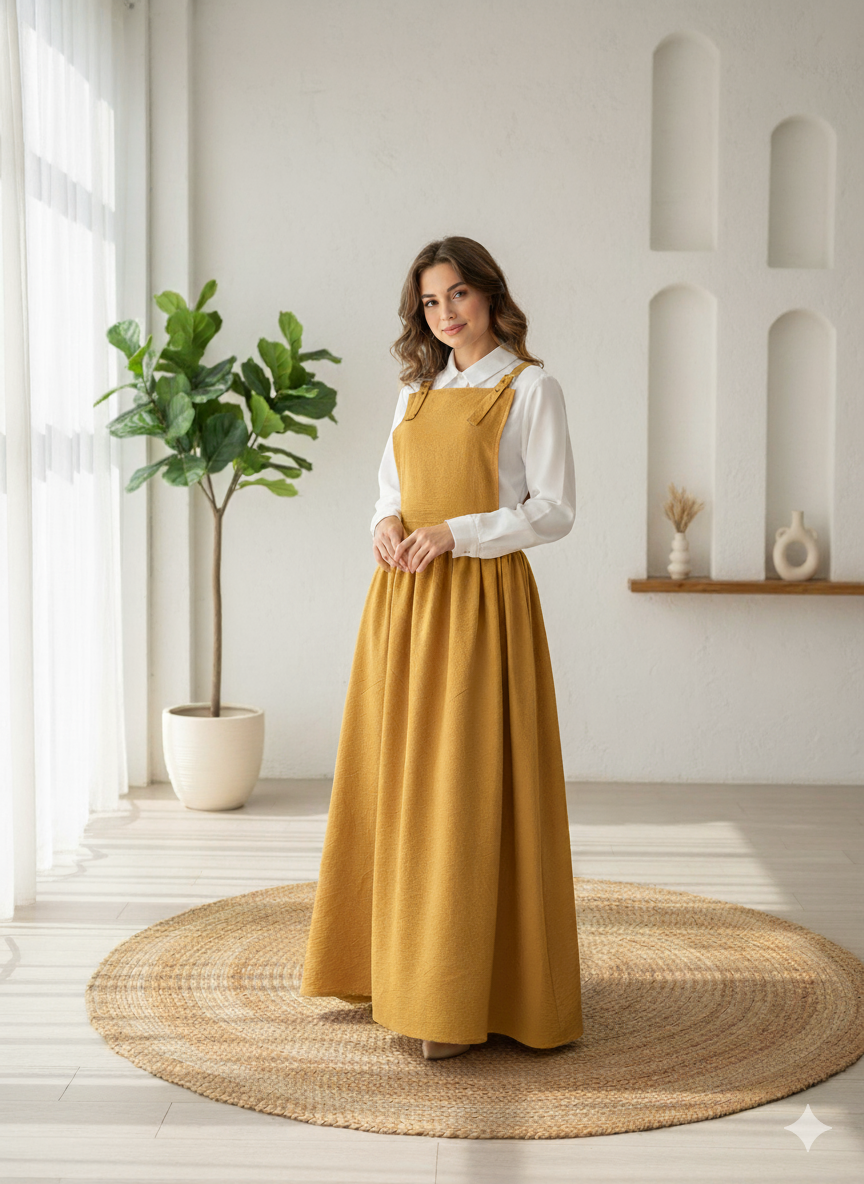 Stylish 2-piece pinafore maxi dress featuring a crisp white collared shirt paired with a rust-orange textured georgette pinafore. Designed with adjustable straps, a gathered waist, and a flowing maxi flare for an elegant yet modest look. Perfect for casual wear, work, or semi-formal gatherings.