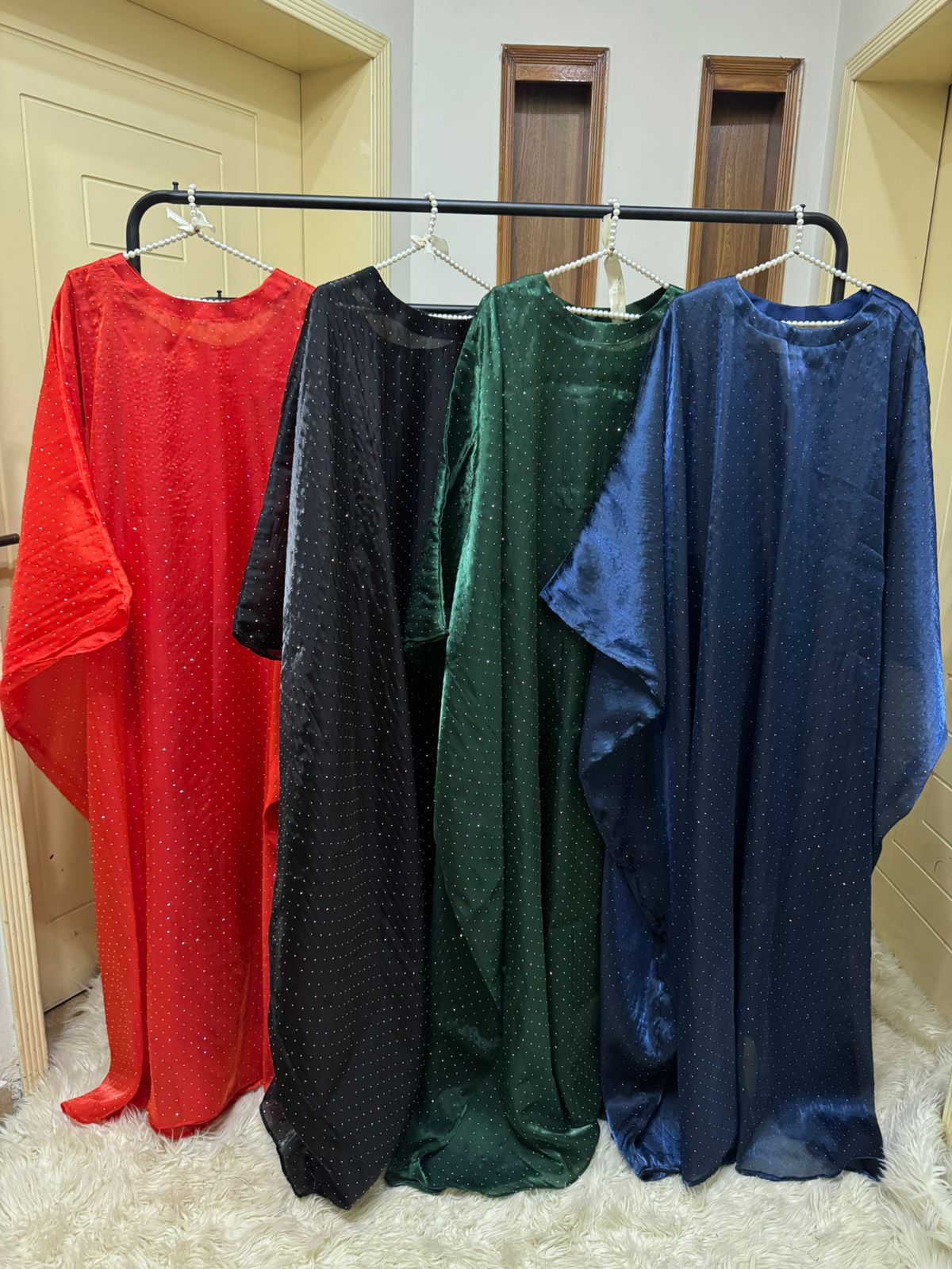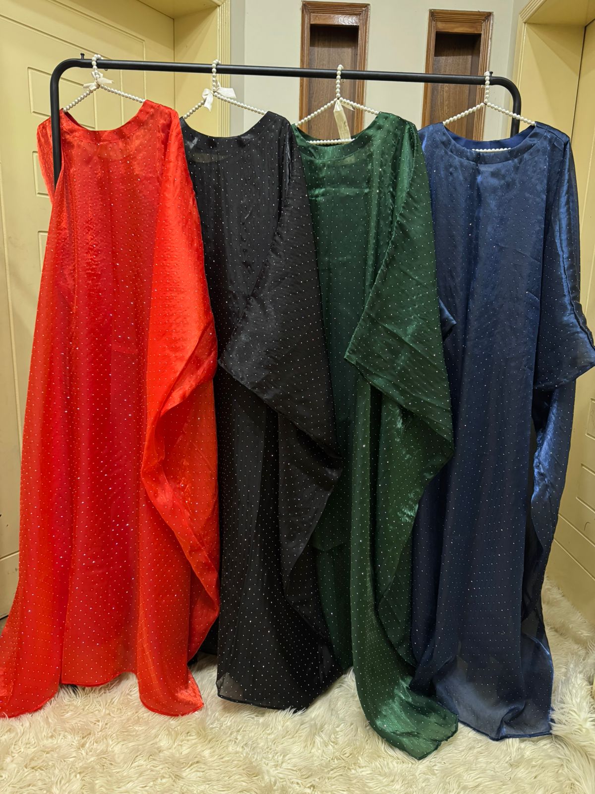 Crafted from premium Shisha Silk, this kaftan features exquisite stone work detailing that sparkles with every movement. It includes a separate inner for full coverage and comfort, along with a belt for a waist-snatching silhouette, giving you a graceful, flattering fit.