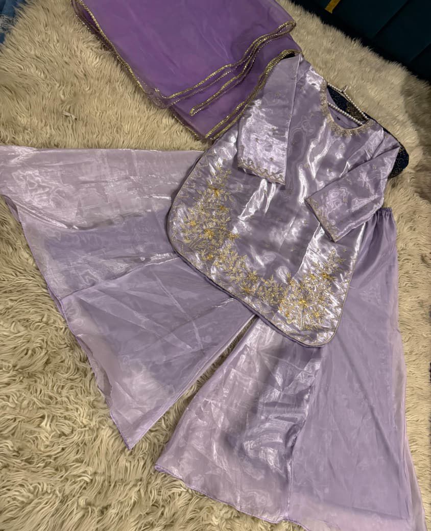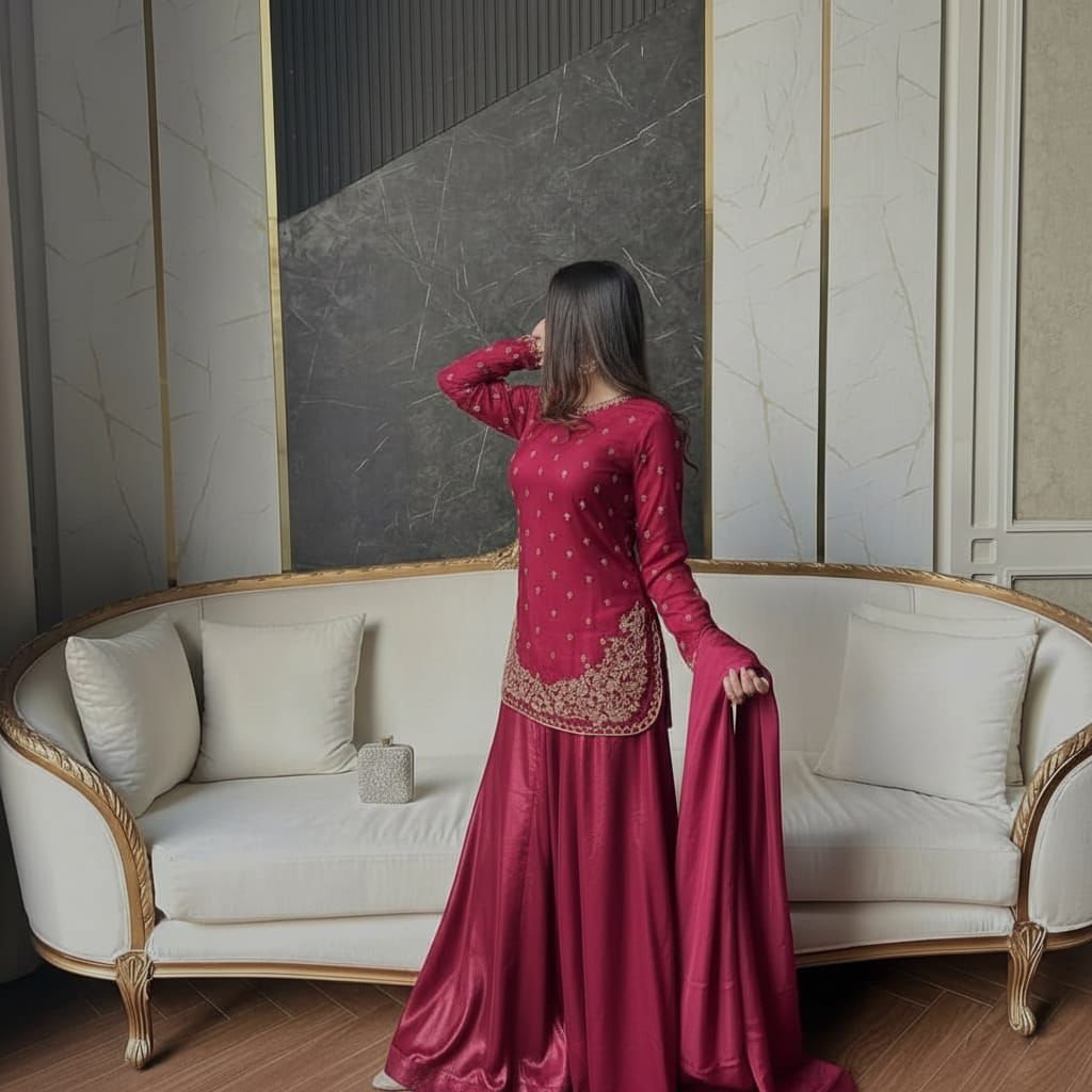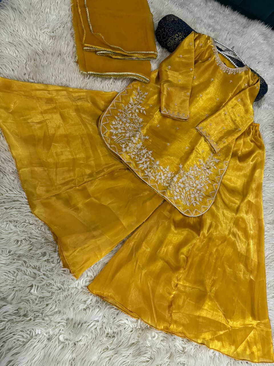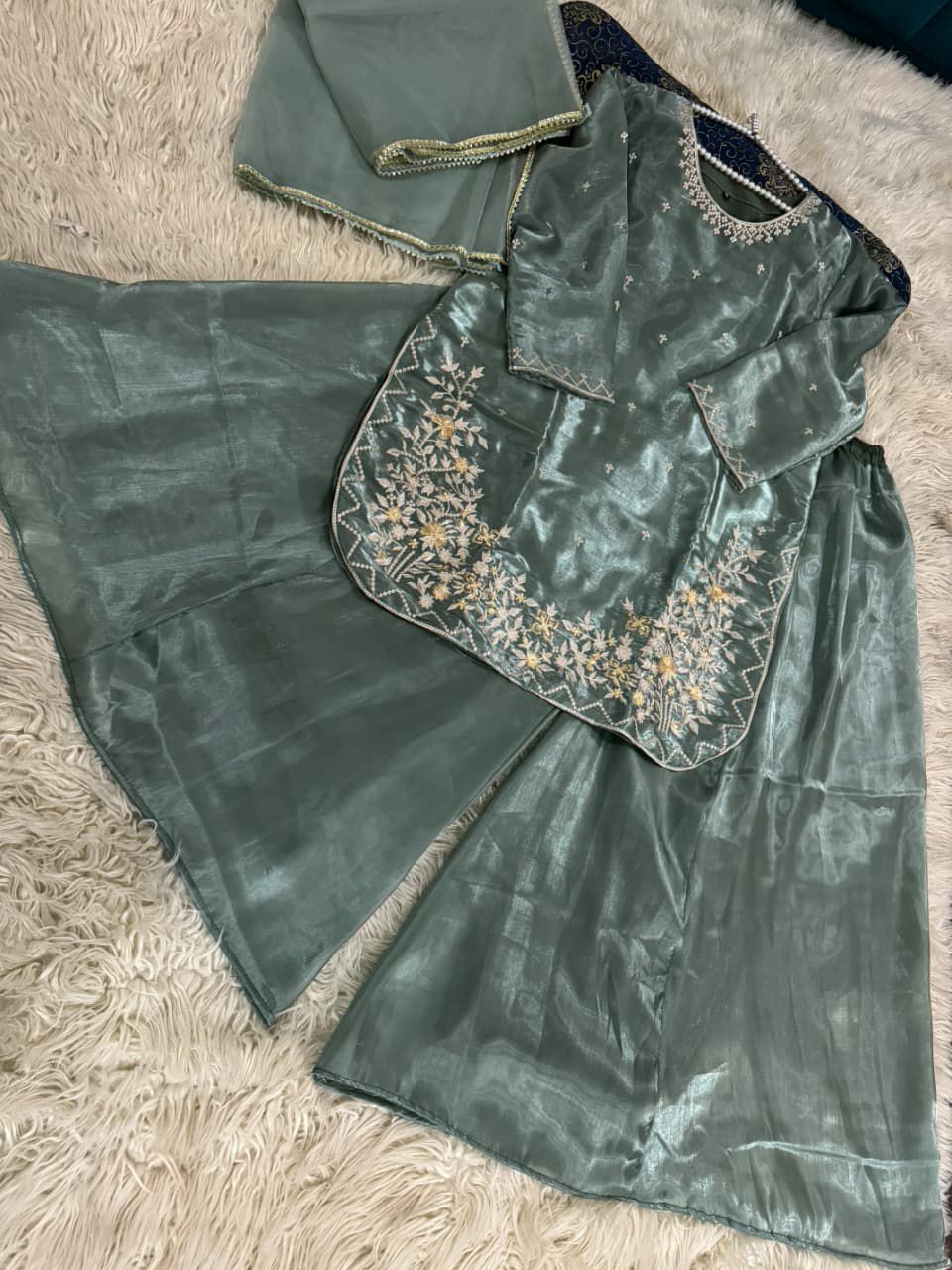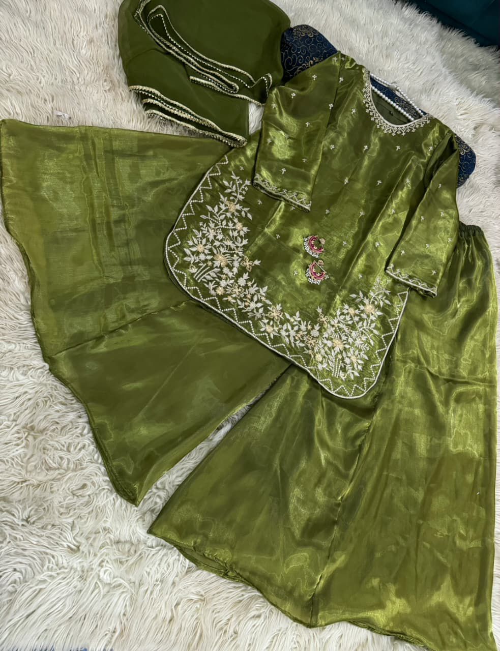 Sequins Tilla Embroidered 3PC Shesha Silk Sharara Set