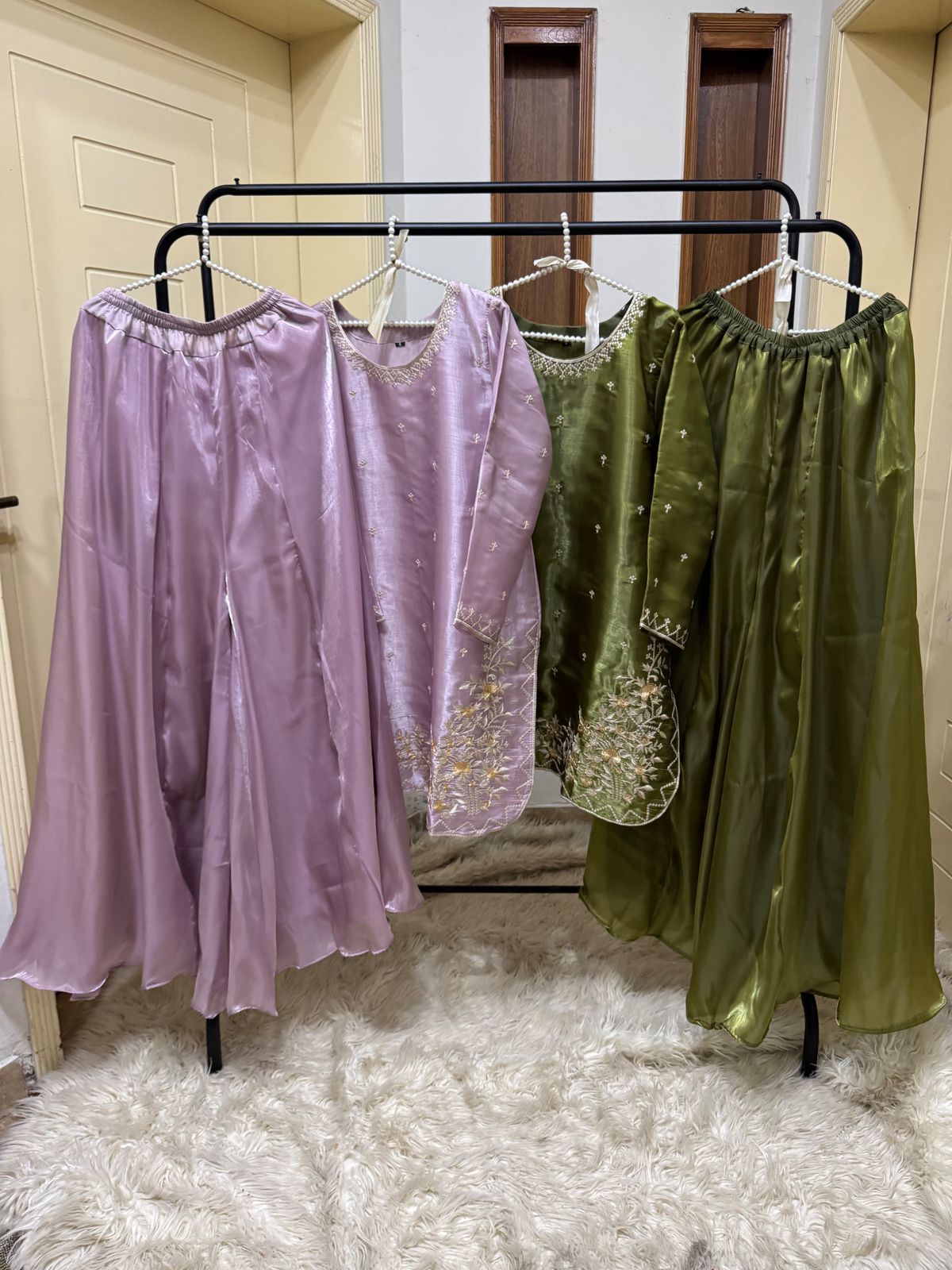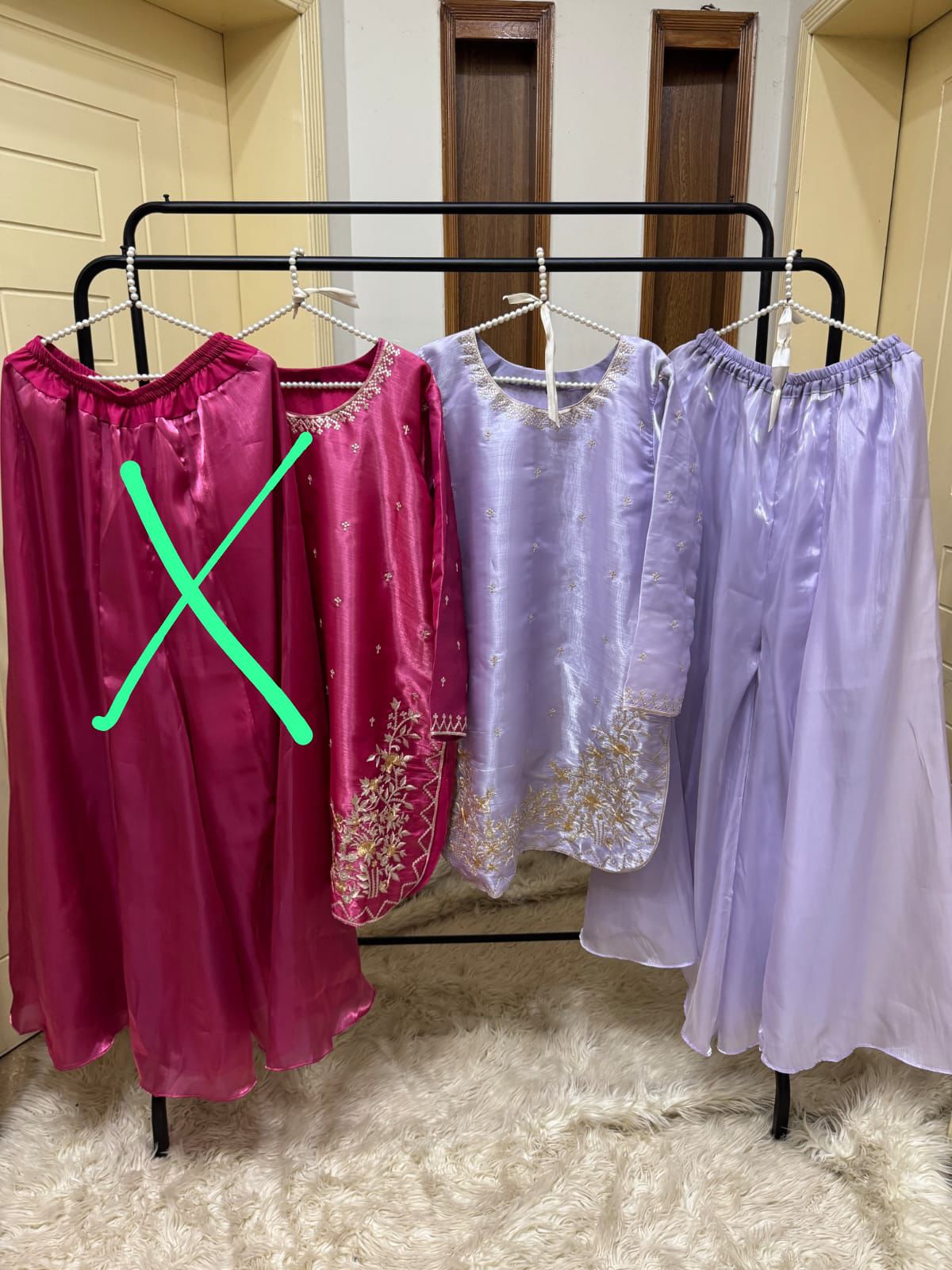 The shirt is made of Shesha Silk with full inner attached (inner fabric: malai). The flairy sharara also comes with full inner lining for comfort and volume. Completing the look is a 3-yard organza dupatta, embellished with gotta laces for a festive, luxurious finish.