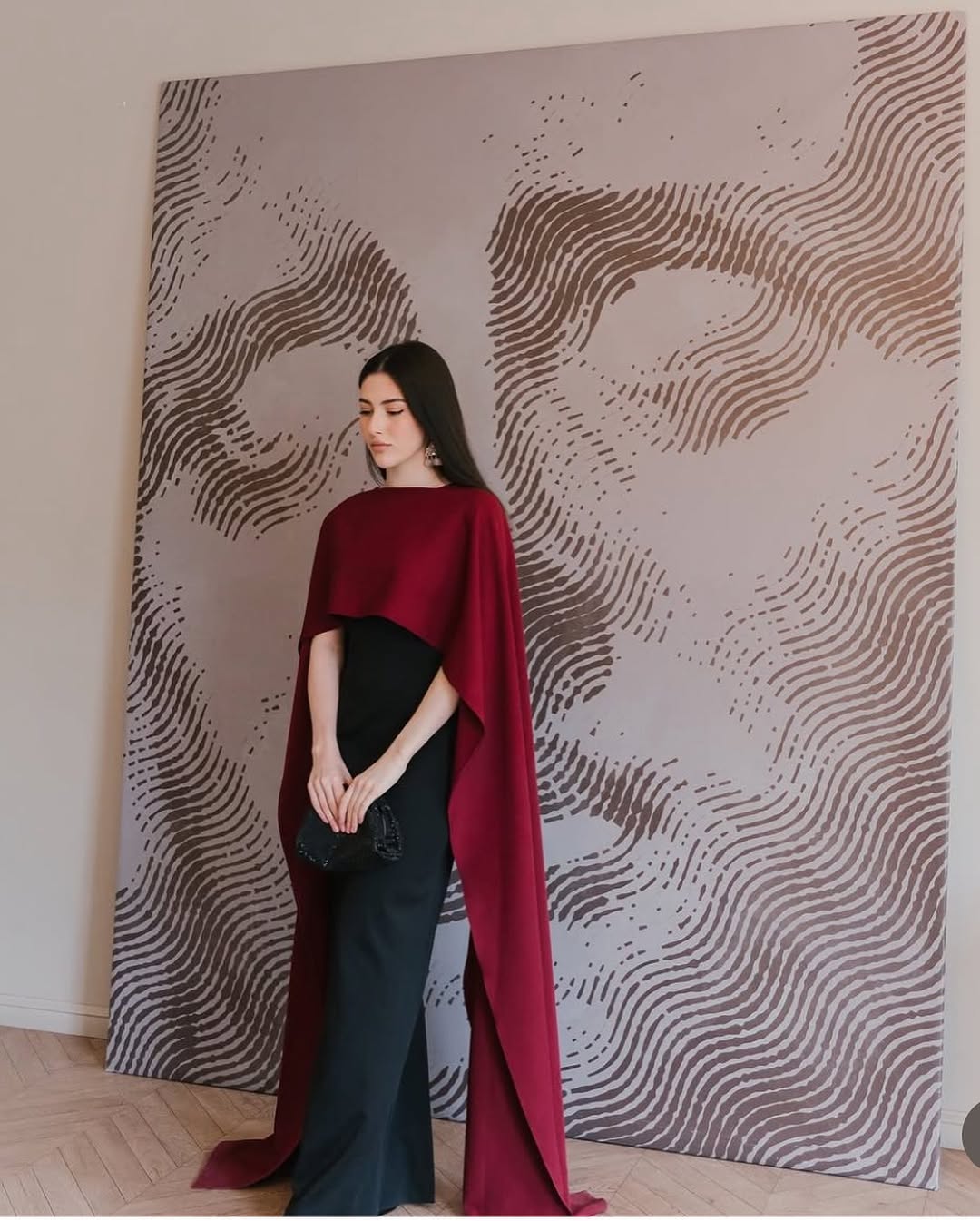 Turn every entrance into a moment of style with this Elegant Maroon Cape Gown. The luxurious maroon outer layer drapes gracefully, giving a royal flair to your overall look. Beneath it, a sleek black fitted inner dress adds contrast and sophistication.