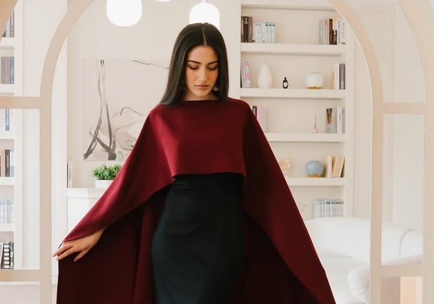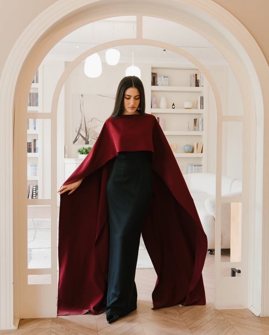 Shop the Elegant Maroon Cape Gown with Black Fitted Inner – a luxurious evening wear piece featuring a dramatic flow and premium finish. Available in Medium and Large sizes at MinesLight.